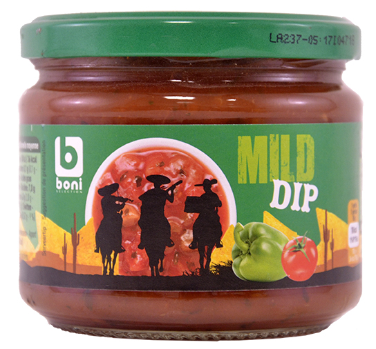 37,4 % tomates, eau, oignons, 8 % pâte de tomates, 6 % poivrons verts, 2,4 % piments jalapeño, amidon modifié, vinaigre, sucre, sel, ail, antioxydant (E300), persil, coriandre, arôme.